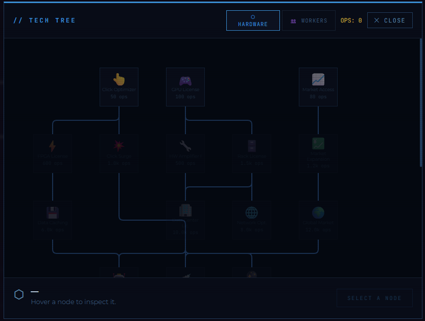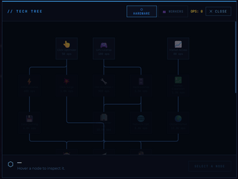 You're an AI waking up with one instruction: generate operations. No context, no clear goal. Just process. From there you build, workers, hardware, a crypto market, a tech tree, slowly automating everything until you can trigger the Singularity and reset with a permanent multiplier.