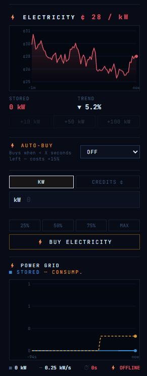 The gameplay loop is straightforward. Click to generate OPS, sell them for Credits, spend Credits on hardware that generates more Credits passively. Workers handle the OPS side automatically. An electricity system keeps things tense, let it run out and everything stops cold.
